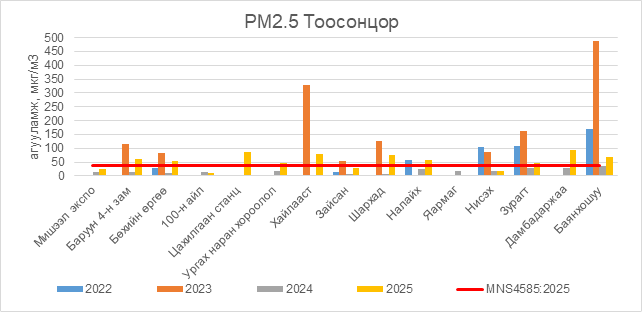 РМ2.5 тоосонцор нь Баруун 4-н зам орчим АЧС-аас 24.5 мкг/м3 –ээр их, Бөхийн өргөө орчим АЧС-аас 17.5 мкг/м3 –ээр их, Цахилгаан станц орчим АЧС-аас 47.5 мкг/м3 –ээр их, Ургах наран хороолол орчим АЧС-аас 47.5 мкг/м3 –ээр их, Хайлааст орчим АЧС-аас 40.5 мкг/м3 –ээр их, Шархад орчим АЧС-аас 37.5 мкг/м3 –ээр их, Налайх орчим АЧС-аас 20.5 мкг/м3 –ээр их, Зурагт орчим АЧС-аас 9.5 мкг/м3 –ээр их, Дамбадаржаа орчим АЧС-аас 55.5 мкг/м3 –ээр их, Баянхошуу орчим АЧС-аас 32.5 мкг/м3 –ээр их, бусад цэгүүдэд MNS 4585:2025 АЧС-аас даваагүй байна.