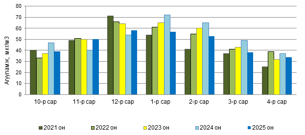 Зураг 5. PM10 тоосонцрын 12 дугаар сарын дундаж агууламж, 2021-2025 он