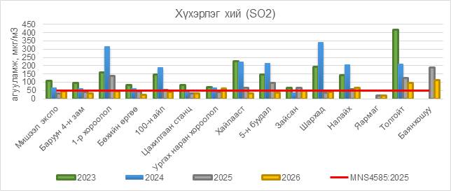 2026 оны 01 дүгээр сарын 07-ны байдлаар хүхэрлэг хий (SO2) нь Ургах наран хороолол орчим АЧС-аас 10 мкг/м3 –ээр их, Налайх орчим АЧС-аас 14 мкг/м3 –ээр их, Толгойт орчим АЧС-аас 44 мкг/м3 –ээр их, Баянхошуу орчим АЧС-аас 61 мкг/м3 –ээр их, бусад цэгүүдэд MNS 4585:2025 АЧС-аас даваагүй байна.