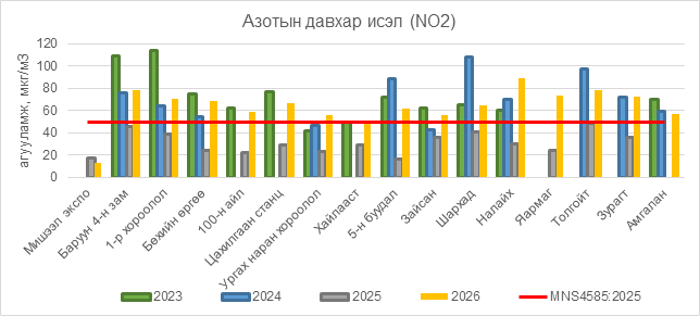 Азотын давхар исэл (NO2) нь Баруун 4-н зам орчим АЧС-аас 28 мкг/м3 –ээр их, 1-р хороолол орчим 21 мкг/м3 –ээр их, Бөхийн өргөө орчим АЧС-аас 19 мкг/м3 –ээр их, 100-н айл орчим АЧС-аас 9 мкг/м3 –ээр их, Цахилгаан станц орчим АЧС-аас 17 мкг/м3 –ээр их, Ургах наран хороолол орчим АЧС-аас 6 мкг/м3 –ээр их, 5-н буудал орчим АЧС-аас 12 мкг/м3 –ээр их, Зайсан орчим АЧС-аас 6 мкг/м3 –ээр их, Шархад орчим АЧС-аас 15 мкг/м3 –ээр их, Налайх орчим АЧС-аас 39 мкг/м3 –ээр их, Яармаг орчим АЧС-аас 24 мкг/м3 –ээр их, Толгойт орчим АЧС-аас 28 мкг/м3 –ээр их, Зурагт орчим АЧС-аас 23 мкг/м3 –ээр их, Амгалан орчим АЧС-аас 7 мкг/м3 –ээр их байна.