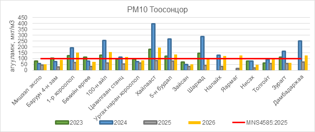 РМ10 тоосонцор нь 1-р хороолол орчим АЧС-аас 52 мкг/м3 –ээр их, 100-н айл орчим АЧС-аас 55 мкг/м3 –ээр их, Цахилгаан станц орчим АЧС-аас 16 мкг/м3 –ээр их, Хайлааст орчим АЧС-аас 94 мкг/м3 –ээр их, 5-н буудал орчим АЧС-аас 37 мкг/м3 –ээр их, Шархад орчим АЧС-аас 5 мкг/м3 –ээр их, Налайх орчим АЧС-аас 21 мкг/м3 –ээр их, Яармаг орчим АЧС-аас 29 мкг/м3 –ээр их, Толгойт орчим АЧС-аас 2 мкг/м3 –ээр их, Дамбадаржаа орчим АЧС-аас 26 мкг/м3 –ээр их, бусад цэгүүдэд MNS 4585:2025 АЧС-аас даваагүй байна.