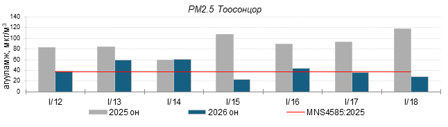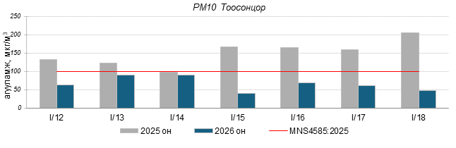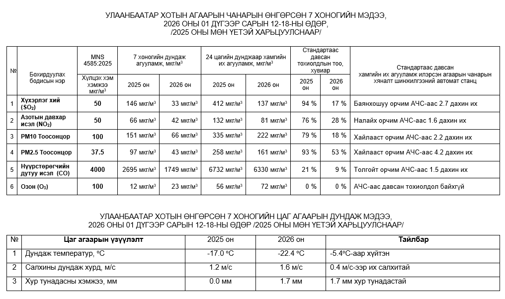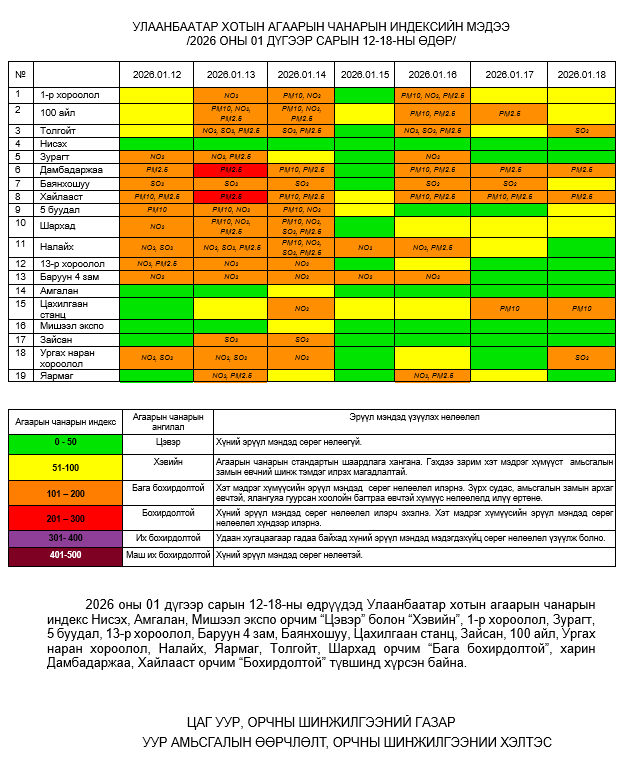 Улаанбаатар хотын агаарт түгээмэл бохирдуулах бодис хүхэрлэг хий /SO2/, азотын давхар исэл /NO2/, тоосонцор /PM10, PM2.5/, нүүрстөрөгчийн дутуу исэл /CO/, озон /O3/-ны агууламжийг тодорхойллоо.