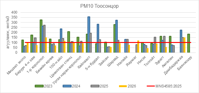 РМ10 тоосонцор нь Мишээл экспо орчим АЧС-аас 6 мкг/м3 –ээр их, 1-р хороолол орчим АЧС-аас 52 мкг/м3 –ээр их, 100-н айл орчим АЧС-аас 19 мкг/м3 –ээр их, Яармаг орчим АЧС-аас 20 мкг/м3 –ээр их, Дамбадаржаа орчим АЧС-аас 51 мкг/м3 –ээр их,  бусад цэгүүдэд MNS 4585:2025 АЧС-аас даваагүй байна.