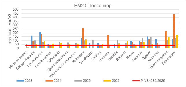 РМ2.5 тоосонцор нь Баруун 4-н зам орчим АЧС-аас 17.5 мкг/м3 –ээр их, 1-р хороолол орчим АЧС-аас 53.5 мкг/м3 –ээр их, Бөхийн өргөө орчим АЧС-аас 21.5 мкг/м3 –ээр их, 100-н айл орчим АЧС-аас 29.5 мкг/м3 –ээр их, Цахилгаан станц орчим АЧС-аас 13.5 мкг/м3 –ээр их, Ургах наран хороолол орчим АЧС-аас 21.5 мкг/м3 –ээр их, Хайлааст орчим АЧС-аас 77.5 мкг/м3 –ээр их, Зайсан орчим АЧС-аас 13.5 мкг/м3 –ээр их, Налайх орчим АЧС-аас 23.5 мкг/м3 –ээр их, Яармаг орчим АЧС-аас 50.5 мкг/м3 –ээр их, Нисэх орчим АЧС-аас 0.5 мкг/м3 –ээр их, Толгойт орчим АЧС-аас 45.5 мкг/м3 –ээр их, Зурагт орчим АЧС-аас 14.5 мкг/м3 –ээр их, Дамбадаржаа орчим АЧС-аас 108.5 мкг/м3 –ээр их,  Баянхошуу орчим АЧС-аас 136.5 мкг/м3 –ээр их байна.