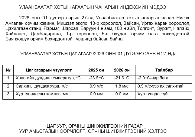 УЛААНБААТАР ХОТЫН АГААРЫН ЧАНАРЫН ХЯНАЛТ ШИНЖИЛГЭЭНИЙ ХОНОГИЙН МЭДЭЭ /2026.01.27/