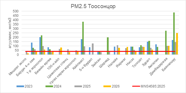 РМ2.5 тоосонцор нь Баруун 4-н зам орчим АЧС-аас 4.5 мкг/м3 –ээр их, 1-р хороолол орчим АЧС-аас 23.5 мкг/м3 –ээр их, Бөхийн өргөө орчим АЧС-аас 1.5 мкг/м3 –ээр их, 100-н айл орчим АЧС-аас 45.5 мкг/м3 –ээр их, Ургах наран хороолол орчим АЧС-аас 1.5 мкг/м3 –ээр их, Налайх орчим АЧС-аас 43.5 мкг/м3 –ээр их, Яармаг орчим АЧС-аас 50.5 мкг/м3 –ээр их, Толгойт орчим АЧС-аас 52.5 мкг/м3 –ээр их, Зурагт орчим АЧС-аас 22.5 мкг/м3 –ээр их, Дамбадаржаа орчим АЧС-аас 64.5 мкг/м3 –ээр их, Баянхошуу орчим АЧС-аас 212.5 мкг/м3 –ээр их байна.