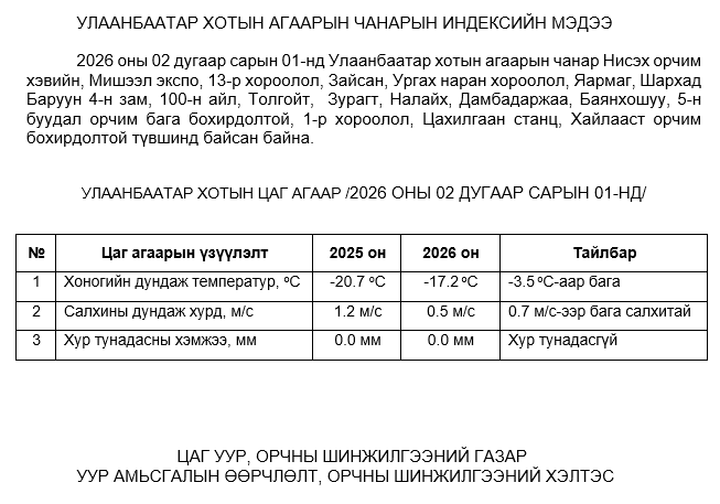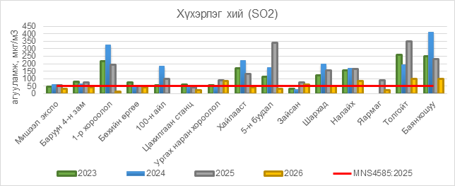 2026 оны 02 дугаар сарын 01-ний байдлаар хүхэрлэг хий (SO2) нь Ургах наран хороолол орчим АЧС-аас 34 мкг/м3 –ээр их, Зайсан орчим АЧС-аас 9 мкг/м3 –ээр их, Шархад орчим АЧС-аас 2 мкг/м3 –ээр их, Налайх орчим АЧС-аас 33 мкг/м3 –ээр их, Толгойт орчим АЧС-аас 49 мкг/м3 –ээр их, Баянхошуу орчим АЧС-аас 50 мкг/м3 –ээр их, бусад цэгүүдэд MNS 4585:2025 АЧС-аас даваагүй байна.