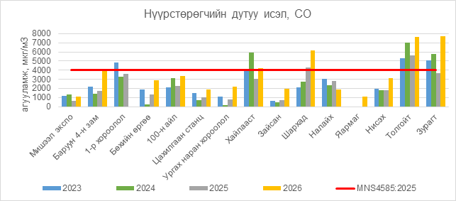 Нүүрстөрөгчийн дутуу исэл (СО) нь Хайлааст орчим АЧС-аас 232 мкг/м3 –ээр их, Шархад орчим АЧС-аас 2184 мкг/м3 –ээр их, Толгойт орчим АЧС-аас 3620 мкг/м3 –ээр их, Зурагт орчим АЧС-аас 3690 мкг/м3 –ээр их, бусад цэгүүдэд MNS 4585:2025 АЧС-аас даваагүй байна.