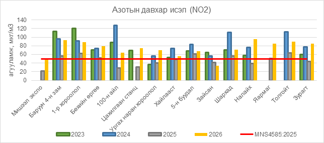 Азотын давхар исэл (NO2) нь Баруун 4-н зам орчим АЧС-аас 43 мкг/м3 –ээр их, 1-р хороолол орчим 38 мкг/м3 –ээр их, Бөхийн өргөө орчим АЧС-аас 29 мкг/м3 –ээр их, 100-н айл орчим АЧС-аас 14 мкг/м3 –ээр их, Цахилгаан станц орчим АЧС-аас 24 мкг/м3 –ээр их, Ургах наран хороолол орчим АЧС-аас 20 мкг/м3 –ээр их, Хайлааст орчим АЧС-аас 6 мкг/м3 –ээр их, 5-н буудал орчим АЧС-аас 17 мкг/м3 –ээр их, Шархад орчим АЧС-аас 21 мкг/м3 –ээр их, Налайх орчим АЧС-аас 46 мкг/м3 –ээр их, Яармаг орчим АЧС-аас 35 мкг/м3 –ээр их, Толгойт орчим АЧС-аас 40 мкг/м3 –ээр их, Зурагт орчим АЧС-аас 35 мкг/м3 –ээр их байна.