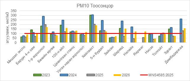 РМ10 тоосонцор нь Баруун 4-н зам орчим АЧС-аас 6 мкг/м3 –ээр их, 1-р хороолол орчим АЧС-аас 70 мкг/м3 –ээр их, 100-н айл орчим АЧС-аас 62 мкг/м3 –ээр их, Цахилгаан станц орчим АЧС-аас 32 мкг/м3 –ээр их, Ургах наран хороолол орчим АЧС-аас 17 мкг/м3 –ээр их, Хайлааст орчим АЧС-аас 90 мкг/м3 –ээр их, 5-н буудал орчим АЧС-аас 24 мкг/м3 –ээр их, Шархад орчим АЧС-аас 56 мкг/м3 –ээр их, Налайх орчим АЧС-аас 21 мкг/м3 –ээр их, Яармаг орчим АЧС-аас 24 мкг/м3 –ээр их, Дамбадаржаа орчим АЧС-аас 59 мкг/м3 –ээр их байна.