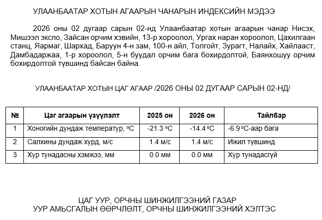 2026 оны 02 дугаар сарын 02-ны байдлаар хүхэрлэг хий (SO2) нь Ургах наран хороолол орчим АЧС-аас 26 мкг/м3 –ээр их, Налайх орчим АЧС-аас 15 мкг/м3 –ээр их, Толгойт орчим АЧС-аас 59 мкг/м3 –ээр их, Баянхошуу орчим АЧС-аас 93 мкг/м3 –ээр их, бусад цэгүүдэд MNS 4585:2025 АЧС-аас даваагүй байна.