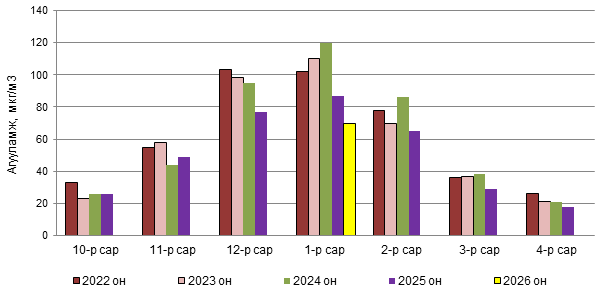 Улаанбаатар хотын агаар дахь PM2.5 тоосонцрын 2026 оны 01 дүгээр сарын дундаж агууламжийг 2022-2024 оны 01 дүгээр сарын дундаж агууламжтай харьцуулахад 32-50 мкг/м3-ээр буюу 31-42 %-иар бага, харин 2025 оны 01 дүгээр сарын дундаж агууламжаас 17 мкг/м3-ээр буюу 19 %-иар бага байна. (Зураг 2).