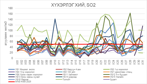 2026 оны 01 дүгээр сарын хүхэрлэг хийн (SO2) хоногийн дундаж агууламж 1-163 мкг/м3 байсан байна. Хүхэрлэг хийн (SO2) хамгийн бага агууламж нь 01 дүгээр сарын 16-нд Зайсан орчим 1 мкг/м3, харин хамгийн их агууламж илэрсэн цэг 01 дүгээр сарын 28-нд 5 буудал орчим 163 мкг/м3 буюу MNS 4585:2025 АЧС-аас 3.2 дахин их байсан байна (Зураг 13).