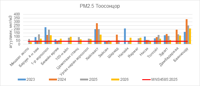 РМ2.5 тоосонцор нь Баруун 4-н зам орчим АЧС-аас 33.5 мкг/м3 –ээр их, 1-р хороолол орчим АЧС-аас 82.5 мкг/м3 –ээр их, Бөхийн өргөө орчим АЧС-аас 37.5 мкг/м3 –ээр их, 100-н айл орчим АЧС-аас 61.5 мкг/м3 –ээр их, Цахилгаан станц орчим АЧС-аас 28.5 мкг/м3 –ээр их, Ургах наран хороолол орчим АЧС-аас 30.5 мкг/м3 –ээр их, Хайлааст орчим АЧС-аас 90.5 мкг/м3 –ээр их, Налайх орчим АЧС-аас 49.5 мкг/м3 –ээр их, Яармаг орчим АЧС-аас 48.5 мкг/м3 –ээр их, Толгойт орчим АЧС-аас 37.5 мкг/м3 –ээр их, Зурагт орчим АЧС-аас 18.5 мкг/м3 –ээр их, Дамбадаржаа орчим АЧС-аас 77.5 мкг/м3 –ээр их, Баянхошуу орчим АЧС-аас 174.5 мкг/м3 –ээр их байна.