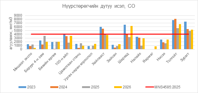 Нүүрстөрөгчийн дутуу исэл (СО) нь Шархад орчим АЧС-аас 2236 мкг/м3 –ээр их, Толгойт орчим АЧС-аас 2730 мкг/м3 –ээр их, Зурагт орчим АЧС-аас 1213 мкг/м3 –ээр их, бусад цэгүүдэд MNS 4585:2025 АЧС-аас даваагүй байна.
