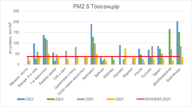 РМ2.5 тоосонцор нь 1-р хороолол орчим АЧС-аас 12.5 мкг/м3 –ээр их, Хайлааст орчим АЧС-аас 11.5 мкг/м3 –ээр их, Налайх орчим АЧС-аас 36.5 мкг/м3 –ээр их, бусад цэгүүдэд MNS 4585:2025 АЧС-аас даваагүй байна.