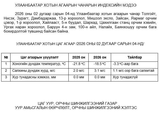 2026 оны 02 дугаар сарын 04-ний байдлаар хүхэрлэг хий (SO2) нь Ургах наран хороолол орчим АЧС-аас 32 мкг/м3 –ээр их, Баянхошуу орчим АЧС-аас 4 мкг/м3 –ээр их, бусад цэгүүдэд MNS 4585:2025 АЧС-аас даваагүй байна.