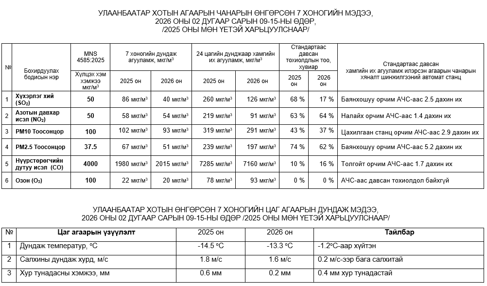 УЛААНБААТАР ХОТЫН АГААРЫН ЧАНАРЫН 7 ХОНОГИЙН МЭДЭЭ /2026.03.02-2026.03.08/