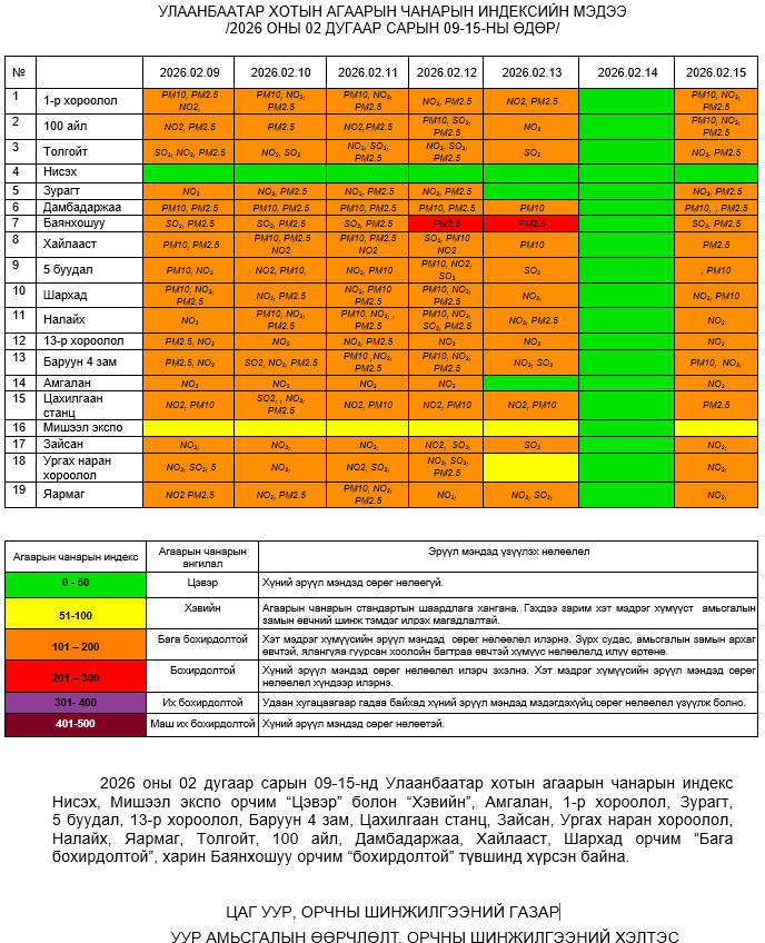 УЛААНБААТАР ХОТЫН АГААРЫН ЧАНАРЫН ХЯНАЛТ ШИНЖИЛГЭЭНИЙ ХОНОГИЙН МЭДЭЭ /2026.03.05/