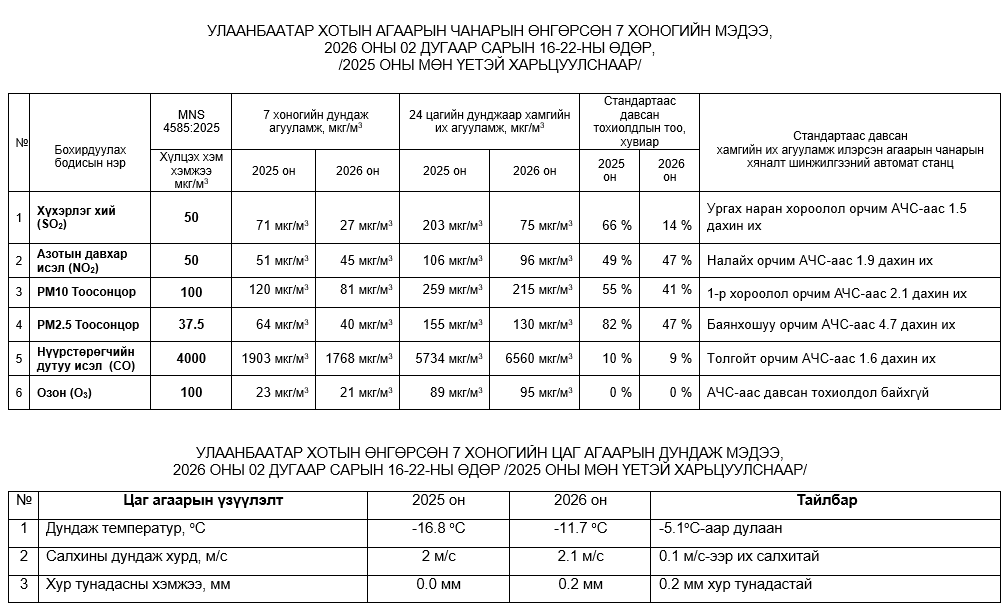 УЛААНБААТАР ХОТЫН АГААРЫН ЧАНАРЫН 7 ХОНОГИЙН МЭДЭЭ /2026.04.06-2026.04.12/
