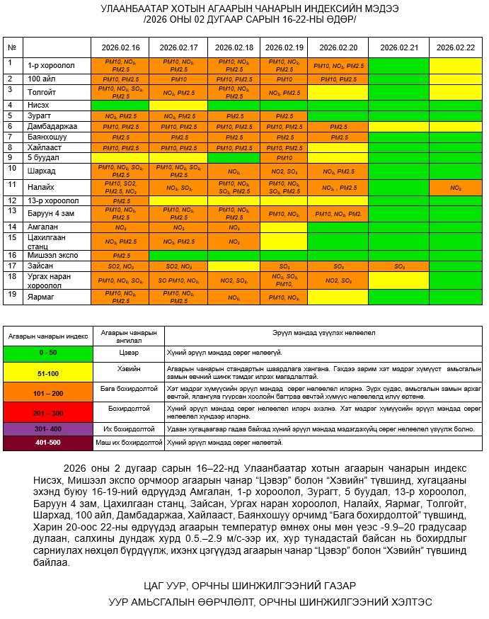 УЛААНБААТАР ХОТЫН АГААРЫН ЧАНАРЫН ХЯНАЛТ ШИНЖИЛГЭЭНИЙ ХОНОГИЙН МЭДЭЭ /2026.04.13/