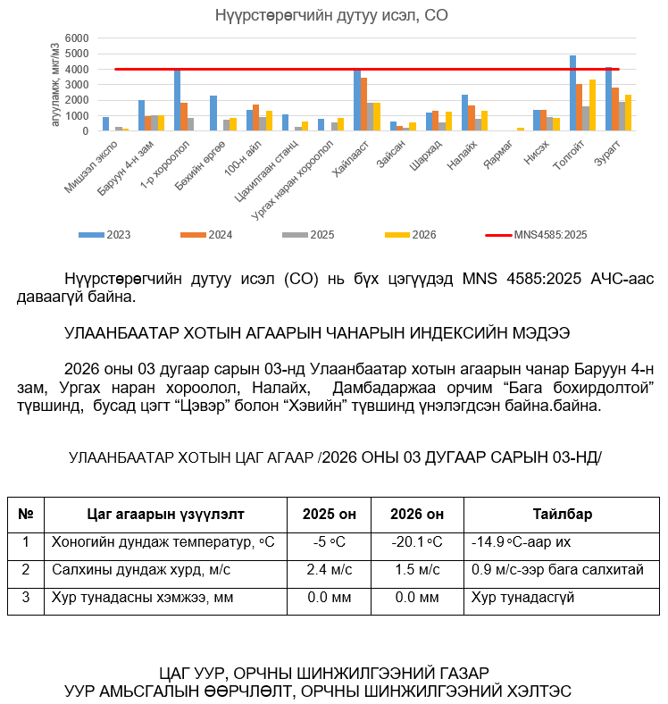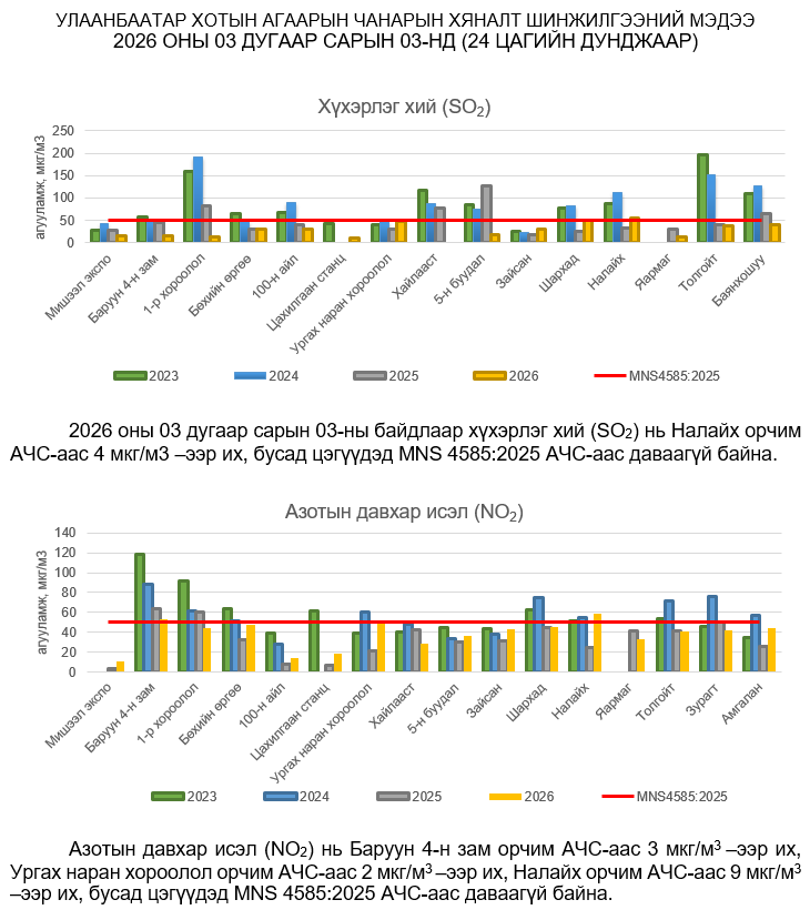 УЛААНБААТАР ХОТЫН АГААРЫН ЧАНАРЫН ХЯНАЛТ ШИНЖИЛГЭЭНИЙ ХОНОГИЙН МЭДЭЭ /2026.03.05/