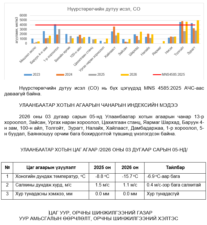 УЛААНБААТАР ХОТЫН АГААРЫН ЧАНАРЫН ХЯНАЛТ ШИНЖИЛГЭЭНИЙ ХОНОГИЙН МЭДЭЭ /2026.04.15/