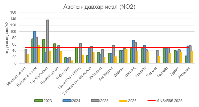 Азотын давхар исэл (NO2) нь Баруун 4-н зам орчим АЧС-аас 8 мкг/м3 –ээр их, бусад цэгүүдэд MNS 4585:2025 АЧС-аас даваагүй байна.