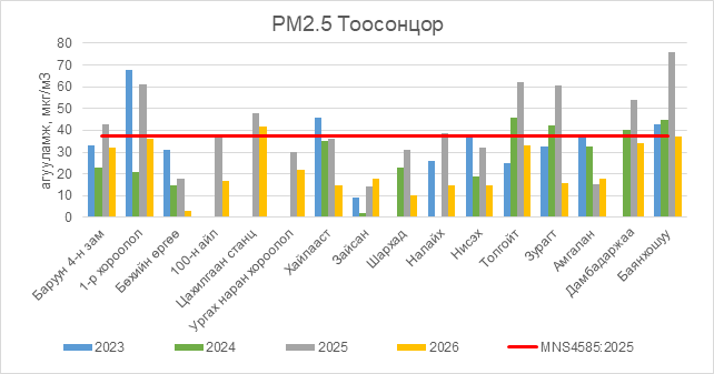 РМ2.5 тоосонцор нь Цахилгаан станц орчим АЧС-аас 4.5 мкг/м3 –ээр их, бусад цэгүүдэд MNS 4585:2025 АЧС-аас даваагүй байна.