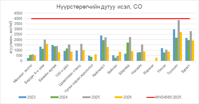 Нүүрстөрөгчийн дутуу исэл (СО) нь бүх цэгүүдэд MNS 4585:2025 АЧС-аас даваагүй байна.