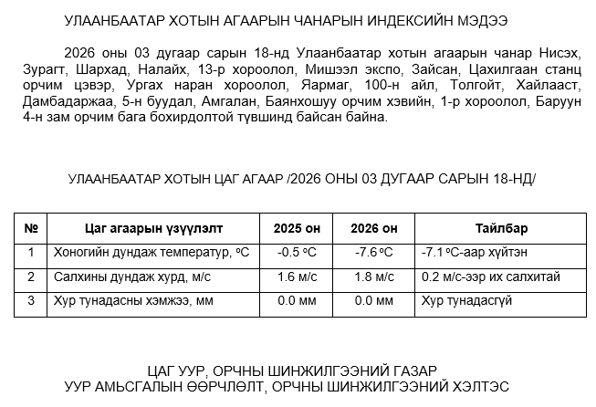 2026 оны 03 дугаар сарын 18-ны байдлаар хүхэрлэг хий (SO2) нь бүх цэгүүдэд MNS 4585:2025 АЧС-аас даваагүй байна.