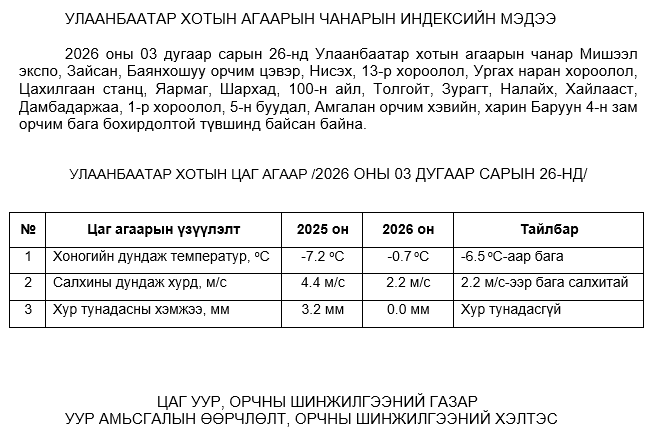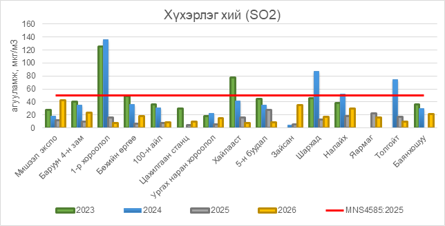 2026 оны 03 дугаар сарын 26-ны байдлаар хүхэрлэг хий (SO2) нь бүх цэгүүдэд MNS 4585:2025 АЧС-аас даваагүй байна.