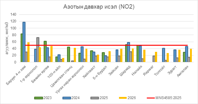 Азотын давхар исэл (NO2) нь Баруун 4-н зам орчим АЧС-аас 8 мкг/м3 –ээр их, бусад цэгүүдэд MNS 4585:2025 АЧС-аас даваагүй байна.