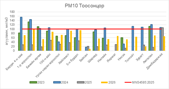 РМ10 тоосонцор нь бүх цэгүүдэд MNS 4585:2025 АЧС-аас даваагүй байна.