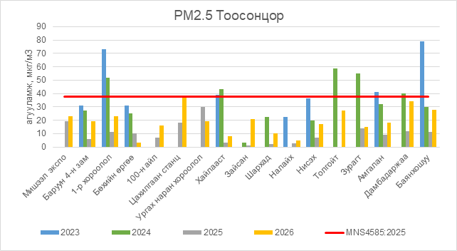 РМ2.5 тоосонцор нь бүх цэгүүдэд MNS 4585:2025 АЧС-аас даваагүй байна.