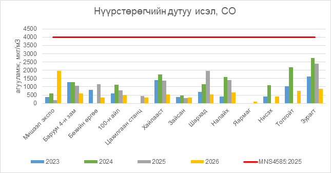 Нүүрстөрөгчийн дутуу исэл (СО) нь бүх цэгүүдэд MNS 4585:2025 АЧС-аас даваагүй байна.