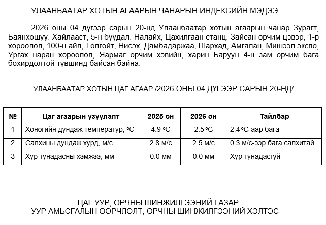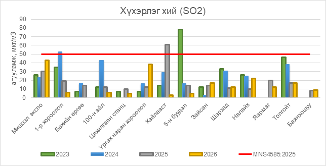 2026 оны 04 дүгээр сарын 20-ны байдлаар хүхэрлэг хий (SO2) нь бүх цэгүүдэд MNS 4585:2025 АЧС-аас даваагүй байна.