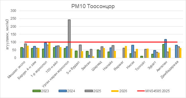 РМ10 тоосонцор нь бүх цэгүүдэд MNS 4585:2025 АЧС-аас даваагүй байна.