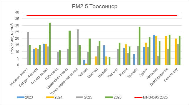 РМ2.5 тоосонцор нь бүх цэгүүдэд MNS 4585:2025 АЧС-аас даваагүй байна.