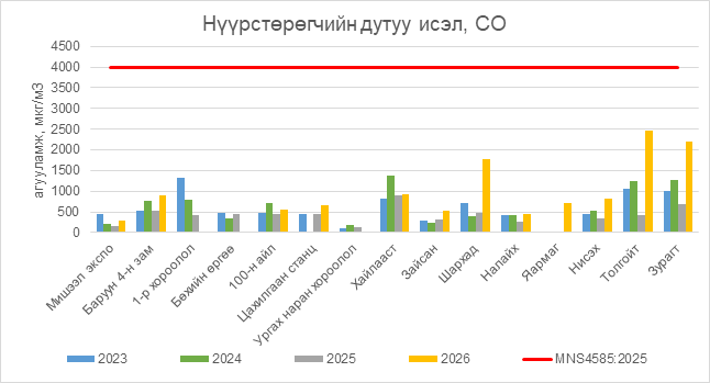 Нүүрстөрөгчийн дутуу исэл (СО) нь бүх цэгүүдэд MNS 4585:2025 АЧС-аас даваагүй байна.