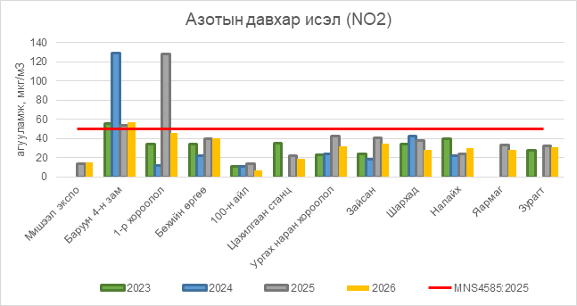 Азотын давхар исэл (NO2) нь Баруун 4-н зам орчим АЧС-аас 7 мкг/м3 –ээр их, бусад цэгүүдэд MNS 4585:2025 АЧС-аас даваагүй байна.