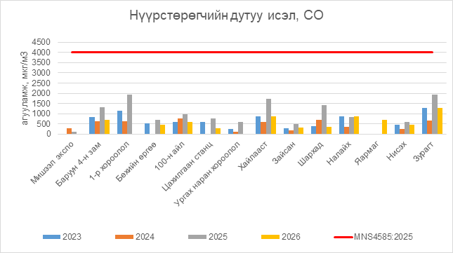 Нүүрстөрөгчийн дутуу исэл (СО) нь бүх цэгүүдэд MNS 4585:2025 АЧС-аас даваагүй байна.
