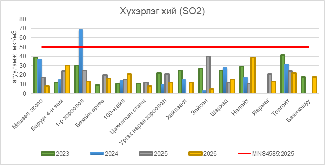 2026 оны 04 дүгээр сарын 28-ны байдлаар хүхэрлэг хий (SO2) бүх цэгт MNS 4585:2025 АЧС-аас даваагүй байна.
