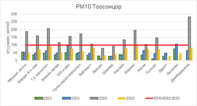 РМ10 тоосонцор Яармаг орчим АЧС-аас 6 мкг/м3 –ээр их, бусад цэгт MNS 4585:2025 АЧС-аас даваагүй байна.