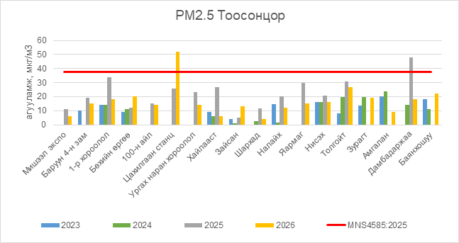 РМ2.5 тоосонцор Цахилгаан станц орчим АЧС-аас 14.5 мкг/м3 –ээр их, бусад цэгт MNS 4585:2025 АЧС-аас даваагүй байна.