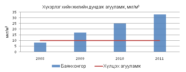 2011 онд Баянхонгор, Дархан, Арвайхээр хотын жилийн дундаж агууламж стандарт хэмжээнээс нилээд давсан бохирдолтой байсан бол Мөрөн,