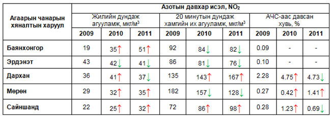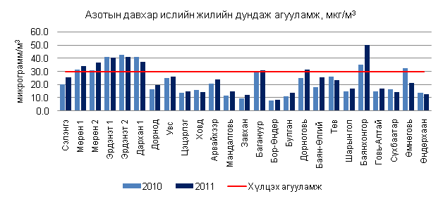 2011 онд азотын давхар ислийн жилийн дундаж агууламж агаарын чанарын стандарт (жилийн дундаж агууламж, 30мкг/м3)-аас Баянхонгор 1.7 дахин, Эрдэнэт 1.4, Дархан 1.23, Мөрөн 1.17 дахин, Сайншанд 1.1 дахин давсан бохирдолтой байна.