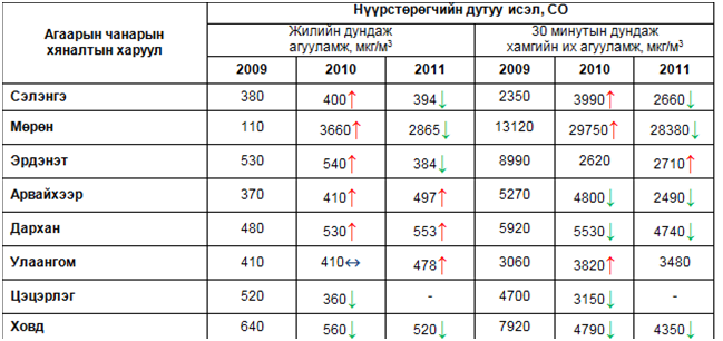 2011 онд эдгээр хотод нүүрстөрөгчийн дутуу ислийн агууламж АЧС (30 минутын дундаж, 60000мкг/м3)-аас давсан бохирдол илрээгүй хэдий ч Мөрөн хотод бусад хотуудаас илүү бохирдолтой байгаа нь ажиглагдаж байна. Өмнөх оноос нүүрстөрөгчийн дутуу ислийн жилийн дундаж агууламж Арвайхээр, Дархан, Улаангом хотуудад 1.0-1.2 дахин ихэссэн байна.
