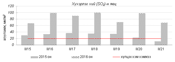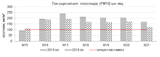 Улаанбаатар хотын агаарт түгээмэл бохирдуулах бодис хүхэрлэг хий /SO2/, азотын давхар исэл /NO2/, тоосонцор /PM10, PM2.5/, нүүрстөрөгчийн дутуу исэл /CO/, озон /O3/-ы агууламжийг тодорхойллоо.