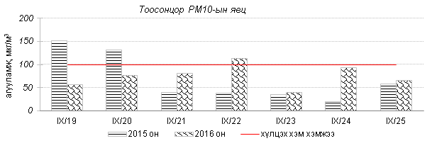 Өнгөрсөн 7 хоногийн агаарын чанарын хяналт шинжилгээний дүнгээр Улаанбаатар хотын төв зам болон гэр хорооллын орчимд агаар “Бага зэргийн бохирдолтой” түвшинд байлаа. Агаар дахь гол бохирдуулах бодис нь азотын давхар исэл NO2, тоосонцор PM10 байна. Дэлгэрэнгүй мэдээллийг хавсралтаас үзнэ үү.